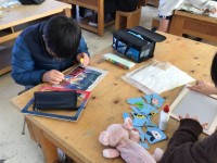 「太陽の光」の学習です。昨日は太陽が出るタイミングと観察のタイミングが合わず、延期していた観察がやっとできました。鏡で太陽の光を集めると明るさや温かさはどうなるのか、何度も試しながら調べました。