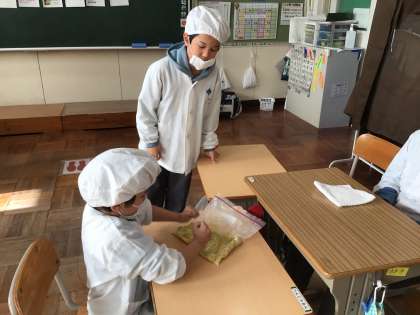 12/17 7、8組スイートポテト作り1 公開日 2024/12/17 更新日 2024/12/17 特別活動 畑で育てたサツマイモを使って、スイートポテト作りをしました。蒸したサツマイモを潰して、砂糖や牛乳、バターを加えていきます。みんな順番を守ってサツマイモを潰したり、材料を混ぜたりすることができました。