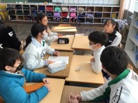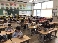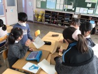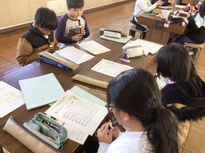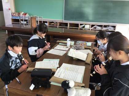 4年音楽では、既習の曲を歌いながら発声練習を行っています。「オーラ リー」もグループ練習の後、2つのパートに分かれて合奏をしました。「パレード ホッホー」の曲を聴いて、前半と後半の旋律の違いをみつけ、ワークシートに記入をしました。