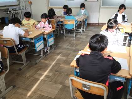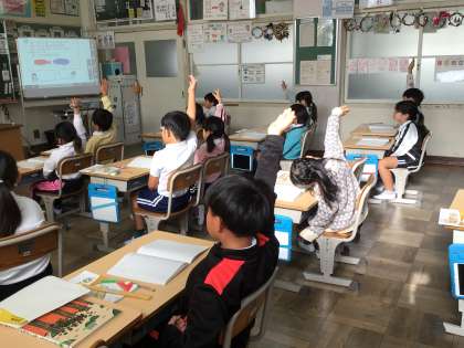 2年生算数では、2つのテープの長さを比べて、長さを求める問題練習をしました。図を描いて求める方法をグループで話し合いました。