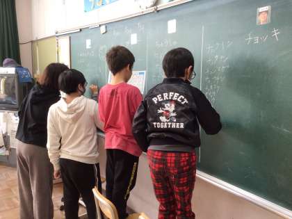 12/18 7、8組国語、算数 公開日 2024/12/18 更新日 2024/12/18 各学年から 7組国語では、「ちゃ、ちゅ、ちょ」のつく言葉集めをしました。黒板にたくさんの言葉を見つけて書くことができました。8組では、1日の学習予定を確認したり、プリント学習をしたりしました。