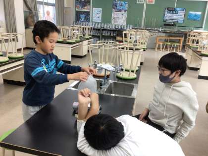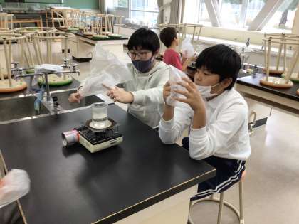 12/18 7、8組理科 公開日 2024/12/18 更新日 2024/12/18 各学年から 水を温めると出てくる湯気の正体を見つける実験をしました。湯気を袋に閉じこめて、しばらく待つと•••「水が出てきた」「袋の中がぬれてる」と湯気の正体に気づいた子ども達。ビーカーの水が温める前よりも減っていることからも湯気の正体が温められた水であることが分かりました。