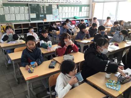 毎週木曜日の朝はフッ化物洗口です。リズミカルな曲に合わせてブクブク口内洗浄をしました。