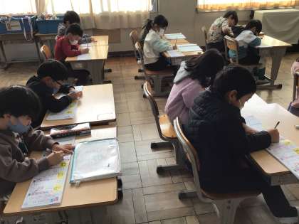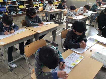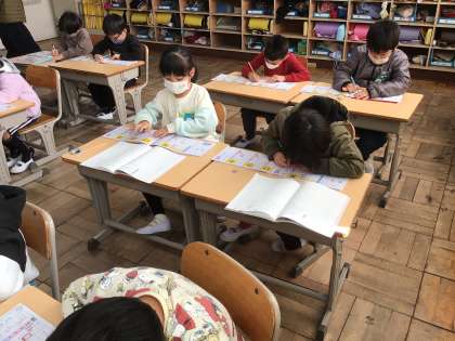 1年生国語では、漢字の練習をしました。「耳」「口」の漢字の書き順を学習して、ドリルやノートに丁寧に書きました。