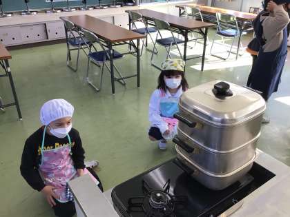 畑で育てたサツマイモを使って鬼まんじゅうを作りました。鬼まんじゅうを蒸している間、蒸し器の前で「湯気がいっぱい出てきた」「焼き芋みたいなにおいがする」とわくわくした様子で待っていました。出来上がった鬼まんじゅう食べ、「もっと食べたい」「家でも作ってみたい」という声が聞こえました。