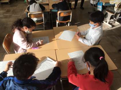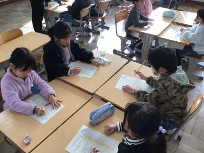 12/20 えがおタイム3 公開日 2024/12/20 更新日 2024/12/20 各学年から 「いいとこみつけ」では、カードに友達のよいところを記入していきます。真剣に考えて書いていますね。来月は「どっちをえらぶ」に変わります。