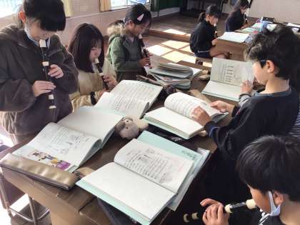 12/23 4年音楽1 公開日 2024/12/23 更新日 2024/12/23 各学年から 4年音楽では、冬休み最後の授業なので歌い納め・吹き納めをしました。校歌に始まり、「さくら さくら」から最近まとめをした「とんび」までたくさんの曲をポイントを確認しながら歌ったり、リコーダー演奏をしたりしました。