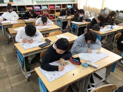 1/9 4年書写 公開日 2025/01/09 更新日 2025/01/09 各学年から 4年書写では、「麦」や「夏」などの字をはらいの方向に気をつけて書くことや、ひらがなの折れに気をつけて丁寧に字を書く練習を行いました。久しぶりの硬筆ですが、集中して丁寧に取り組むことができました。