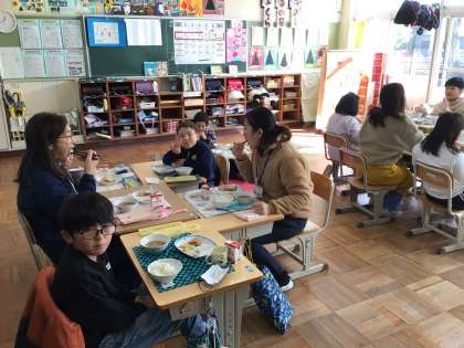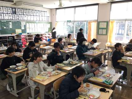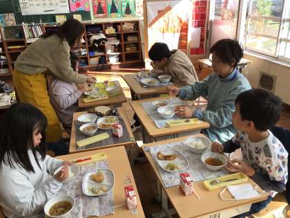 今日の献立は、ごはん、牛乳、にぎすフライ、和風サラダ、かしわ汁です。