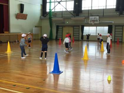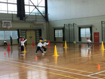1年生体育「ボール遊び」 チームで中と外にわかれ、外の人が投げたボールを内側の人がキャッチするゲームを楽しみました。