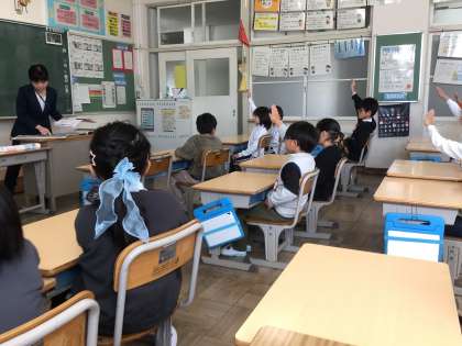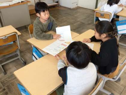 2年生算数では、「九九のきまり」の学習をしています。九九の表にないかけ算を求めるために、グループごとに、絵を見て考えたり、表を見て考えたりしました。