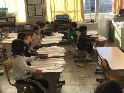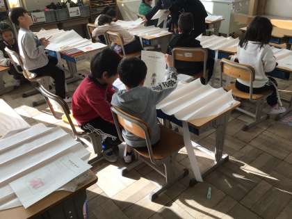 1/17 1年生図工 公開日 2025/01/17 更新日 2025/01/17 各学年から 1年生図工で、「ぐにゃぐにゃだこ」作りをしました。今日は、以前描いた設計図をもとに、色鉛筆で絵を描きました。出来上がった「たこ」をあげるのが楽しみですね。