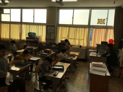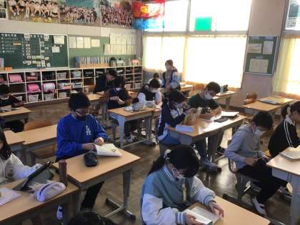 今日も元気よく登校してきました。時間を見ながら、翌日の連絡を記入したり、授業の準備をしたりしていました。