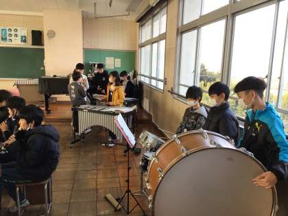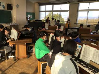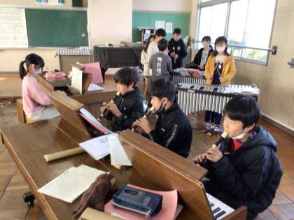 今日の音楽は1・2組合同で行いました。「良いところを見つけて自分の演奏の工夫を書こう」というめあてで学習を進めていました。1組、2組の順で少し練習を行ってから演奏を披露していました。