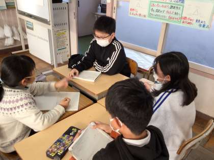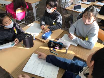 1/23 5年算数2 公開日 2025/01/23 更新日 2025/01/23 各学年から 前回まで習ったことを復習した後で、「割引された商品の代金を求めよう」というめあてで学習を進めていました。班で協力しながら解き方を考えていました。