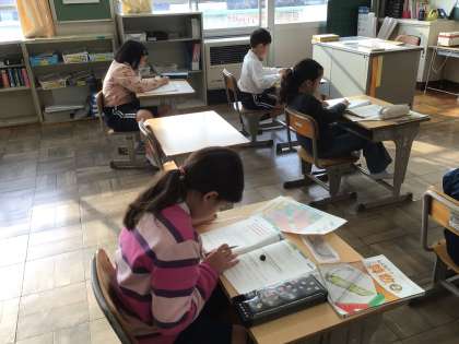 2年生算数の国際学級では、かけ算の復習をしています。算数の友の問題を使って、練習問題を解きました。みんな真剣に考え学習しています。