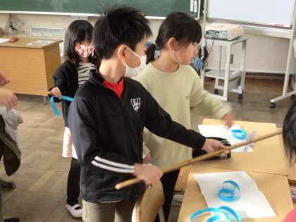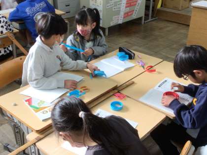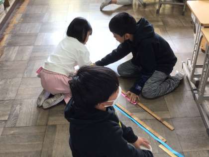 今日の2年生算数では、自分の身長を紙テープで準備し、それを物差しで計りました。グループで工夫して考えました。