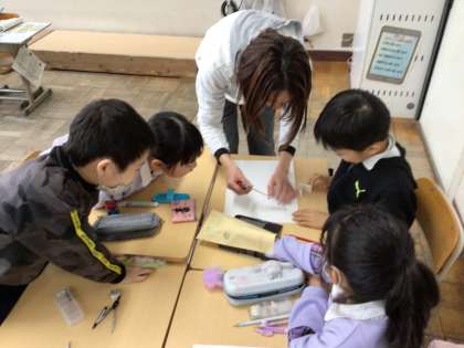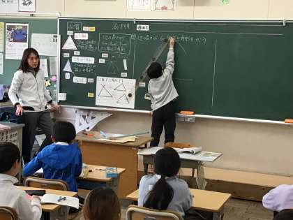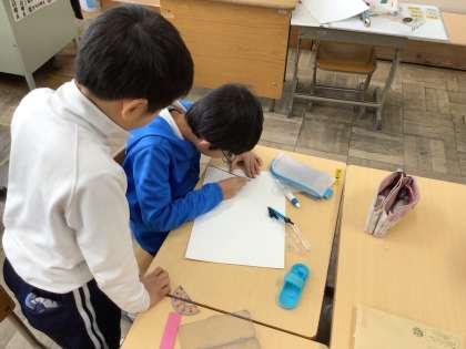 3年算数では、「正三角形と二等辺三角形のかき方を教え合って三角形作図リレーをしよう」というめあてで学習を進めていました。前回学習した二等辺三角形の作図の方法を丁寧に復習をした後、班で協力しながら作図をしていました。