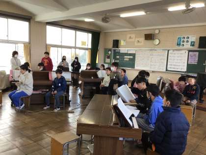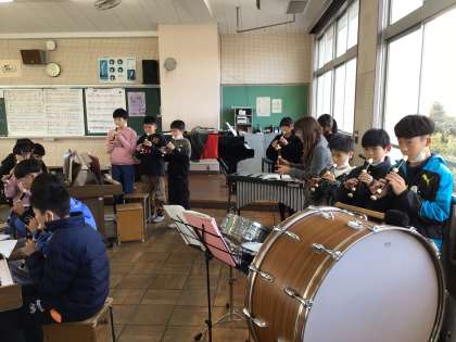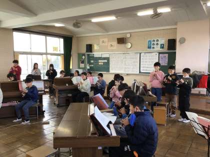1/30 6年音楽1 公開日 2025/01/30 更新日 2025/01/30 各学年から 6年音楽では、曲紹介の後、リコーダー合奏「雨のうた」と「木星」の合奏、2曲を披露しました。この日に向けて何度も練習を重ねてきました。一生懸命演奏する姿がとてもよかったです。