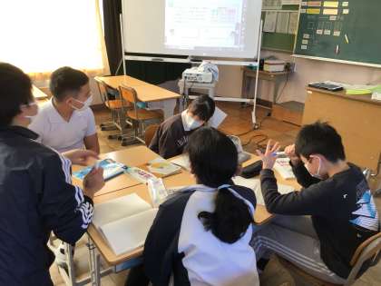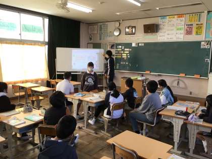 5年算数では、割合の単元について学習をしています。提示された問題をどのように解いたらよいかなど、班で話し合っていました。