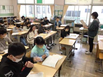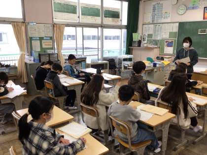 5年国語では、単元テストの返却と解説を行っていました。先生の説明をしっかり聞いて、赤で直しをしていました。
