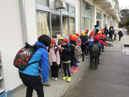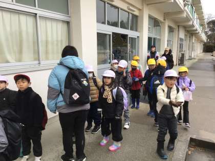 1年生は「トヨタの森」へバスで出かけました。出かけるときに雪がたくさん降ってきて、子どもたちは大喜びでした。寒さに負けず元気に出発していきました。
