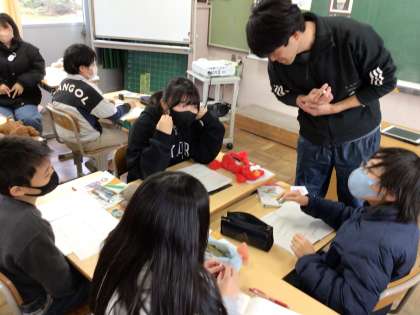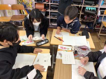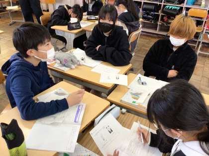 6年算数では、「LEDはどれくらい節約できるのか求めてみよう」というめあてで学習を進めていました。手がかりカードをもとに班で相談しながら、かかる電気代の違いなどを計算していました。