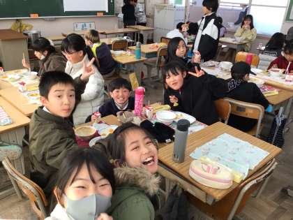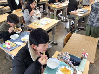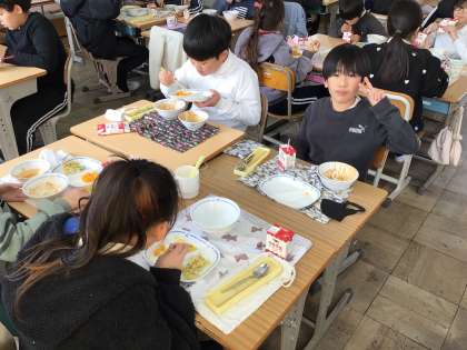 今日の献立は子どもたちが大好きなハヤシライスです。どの学級も楽しそうに会食をしていました。