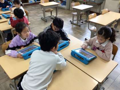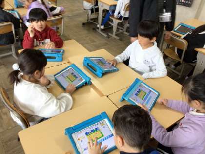 2年学活では、「バスケットボールをしよう」というめあてで、タブレットを活用してプログラミングに挑戦していました。画面に夢中になりながら取り組む様子が印象的でした。思うような動作になったかな?