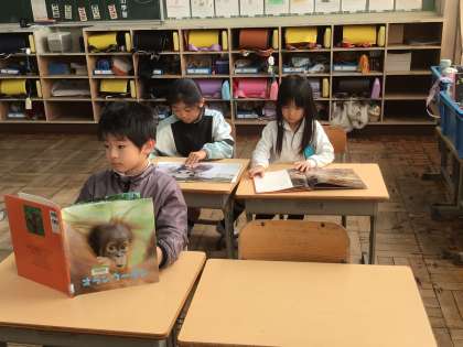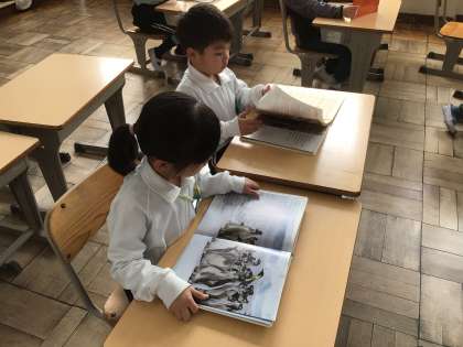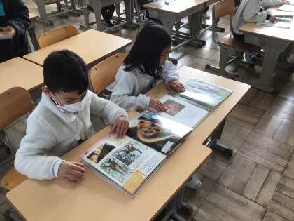 1年生国語「こどもを守る動物たち」で、教科書に出てくる動物以外の動物について、図鑑で調べました。いろいろな動物たちのことがわかりました。