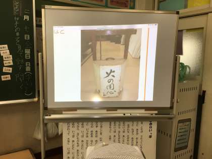 「道具のうつりかわりを説明しよう」の学習です。昔の道具の写真を見て、何かを考えました。下の写真を見て、ストーブ、コンロ、こたつなど子ども達からは様々な予想が出ました。さあ、何の道具でしょう。
