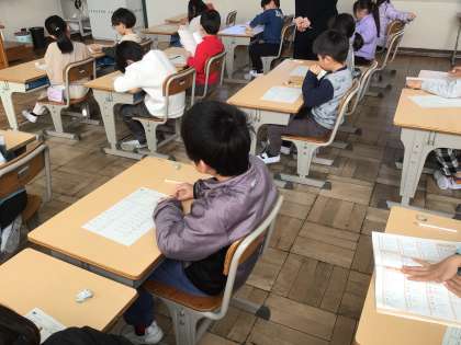 1年生国語では、漢字の学習をしています。授業の初めに漢字の復習で、プリント学習をしました。分からない漢字は、教科書で調べて書きました。