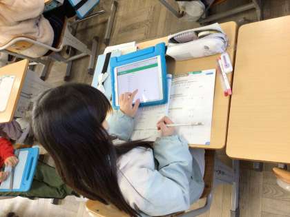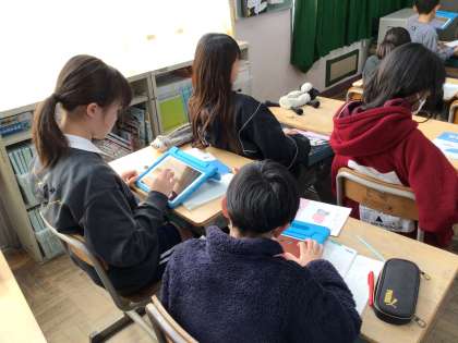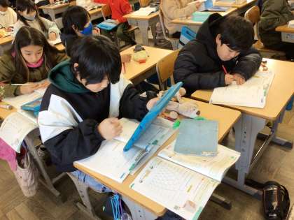 「分数」の学習です。これまで学習したことを算数の友を使って復習しました。よく分からない時は算数の友についているQRコードを学習用タブレットで読み取るとヒントが表示されます。そのヒントを自分で確認しながら問題を解くことができました。