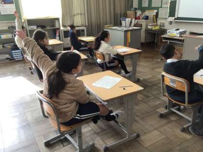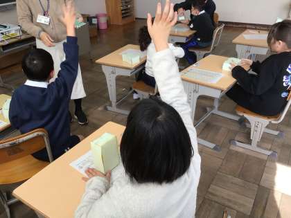 2年生算数の国際学級でも、箱の形について学習しています。今日は、頂点や面にシールをはり、箱にはいくつあるかなどを考えました。
