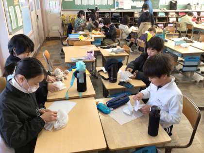 6年生を送る会の準備を進めています。4年生の担当は、6年生が退場する時に使う花アーチ作りです。花アーチに付ける花を丁寧に作っています。