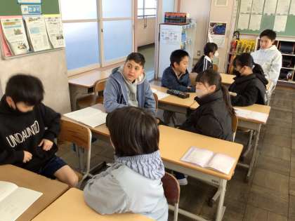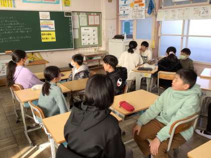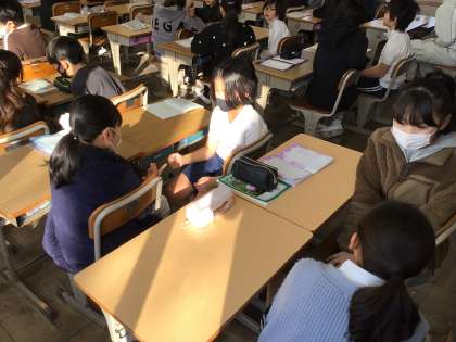 今日も元気よく登校してきました。毎週金曜日はえがおタイムです。8時半になると担任の指示で「しつもん じゃんけん」が始まりました。どの教室も笑顔でいっぱいでした。