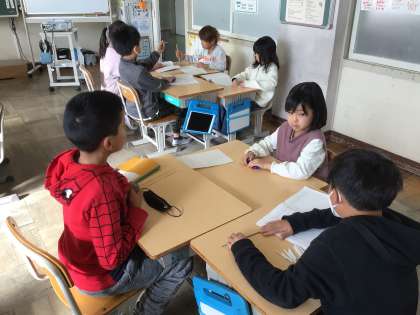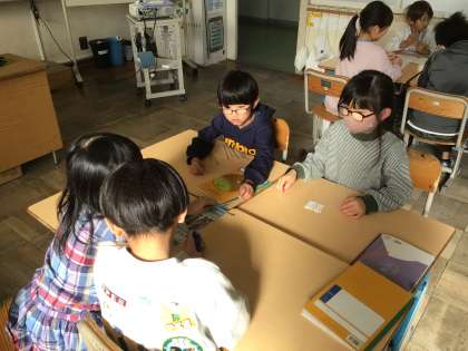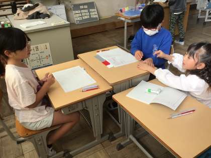 2年生算数では、「箱の形」について学習しています。今日は、3種類の長さの棒とボールで箱の形を作りました。何本いるのか、ボールは何個いるのかをグループで考えて作りました。