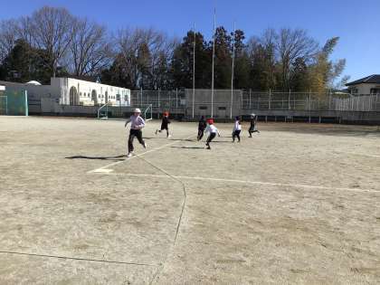 キックベースをしました。相手チームが投げたボールをできるだけ遠くに跳ばそうと力いっぱい蹴ったり、相手チームが蹴ったボールをいち早く取るために一生懸命追いかけたり、気持ちいい青空の下、たくさん体を動かすことができました。