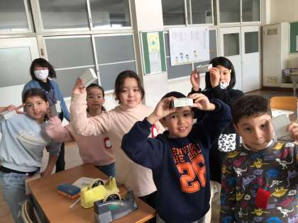 2/14 2年生算数国際 はこの形 公開日 2025/02/14 更新日 2025/02/14 各学年から 今日はこれまで学んできた面の形や数を使って、はこを作りました。 3種類の形を2枚ずつ切り取ることに気付いた子供たちは早速、はこ作りをスタート。 それぞれのつながりを意識しながら、はこが完成しました!