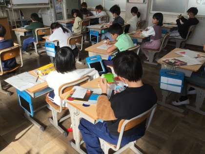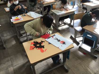 2年生図工では、タックカラー紙版画の学習をしています。カラーの紙を貼って、版画になる絵を考えて、デザインしました。版画を刷るのが楽しみです。