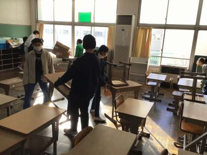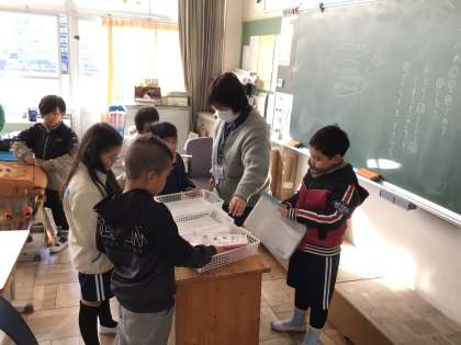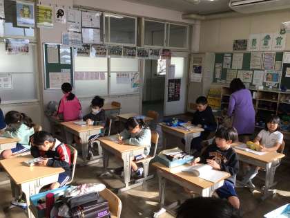 氷点下の寒い朝となりましたが、いつも通り元気よく登校してきました。時間を見て朝の支度をしていました。ワックスがけが終わってぴかぴかの4年教室に、廊下に出しておいた机や椅子を戻す作業もしていました。