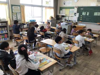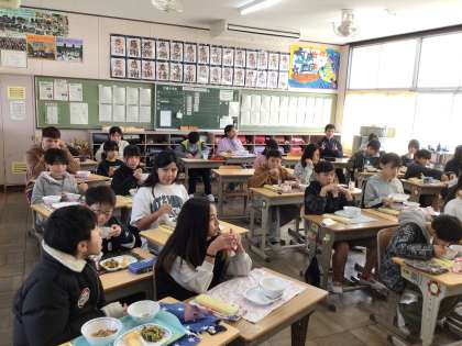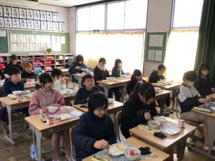 今日の献立はひきずり(鶏肉のすき焼き)という郷土料理でした。どの学級も友達と楽しく会食していました。