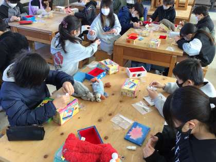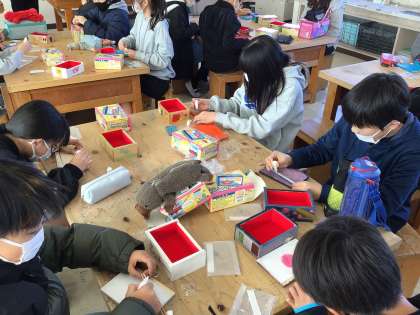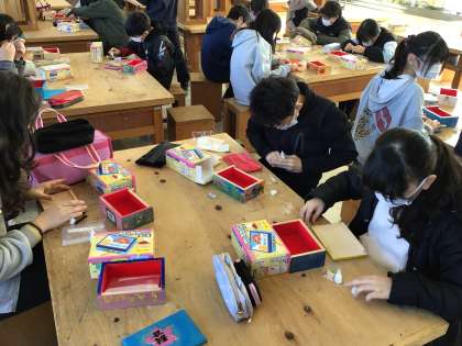 6年図工では卒業制作を行っています。前回までにグランドボックスの色付け作業が完了しているので、ふたの部分を本体に取り付ける作業を行っていました。きれいなデザインのグランドボックスがまもなく完成です。