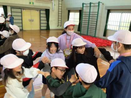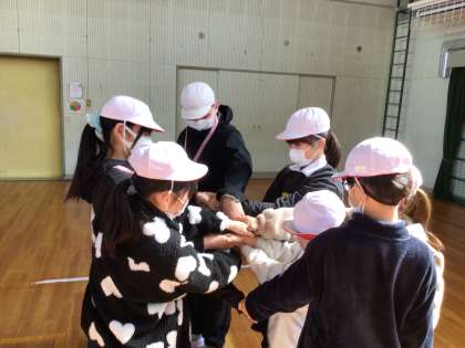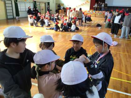 やまびこ班で「人間知恵の輪」というゲームをしました。手をつないだまま、もとの円に戻れたら大成功です。成功した班もそうでない班もどの班からも笑顔がこぼれていました。