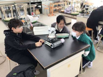 水を沸騰させて、出てくる湯気の正体を確かめる実験をしました。湯気は、水、空気だと思うという予想を立てて実験を始めました。ビーカーの水が温まる様子を観察しながら「泡が出てきた」「炭酸みたい」などというつぶやきが子どもたちから聞こえてきました。湯気が出てきたら、ガラス棒を近づけて湯気の正体を確かめます。さあ、湯気の正体は何でしょうか。
