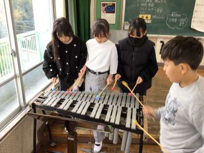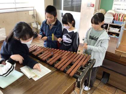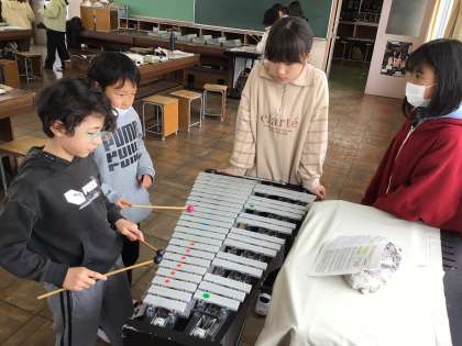 「茶色の小びん」の合奏に関連して、木琴や鉄琴を実際にマレットでたたき、どんな音が鳴るのかなど体験しました。