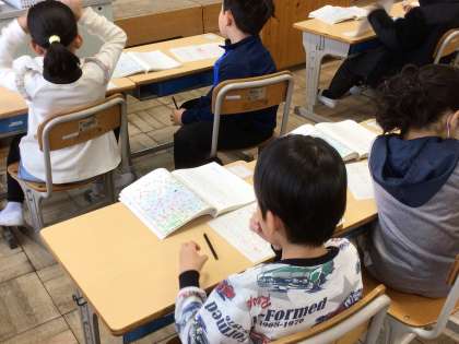 1年生国語では、「スイミー」の学習をしています。今日は、スイミーの様子やくらしについて考えました。「まぐろ」が出てきた時のスイミーの様子を読み取りました。