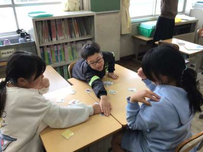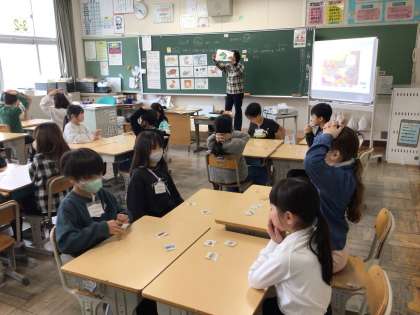 「Who are you?」と尋ね、「I’m ◯◯」と英語で答える学習をしました。ALTの先生と発音の練習をしながら英語の言い方を学びました。カルタゲームを通して楽しく学習することができました。