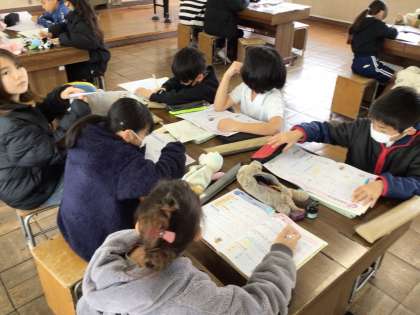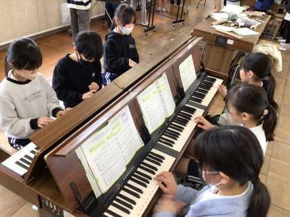 4年音楽では、既習曲と国歌の練習の後、ワークを使って音楽記号の復習を行いました。クレシェンドやデクレシェンドなどの強弱に関わる記号やリピート記号があるときの演奏順などを復習しました。また、前時に続き「茶色の小びん」のパート練習も行いました。