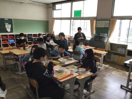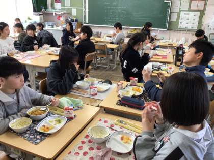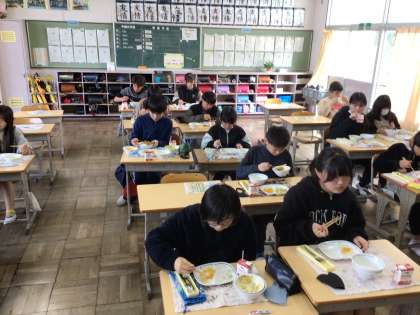 今日の献立は子どもたちの大好きなカレーライスです。どの学級も楽しく会食していました。
